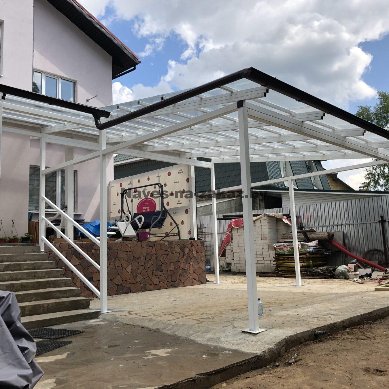 Навес на 2 машины перед домом с кровлей из поликарбоната